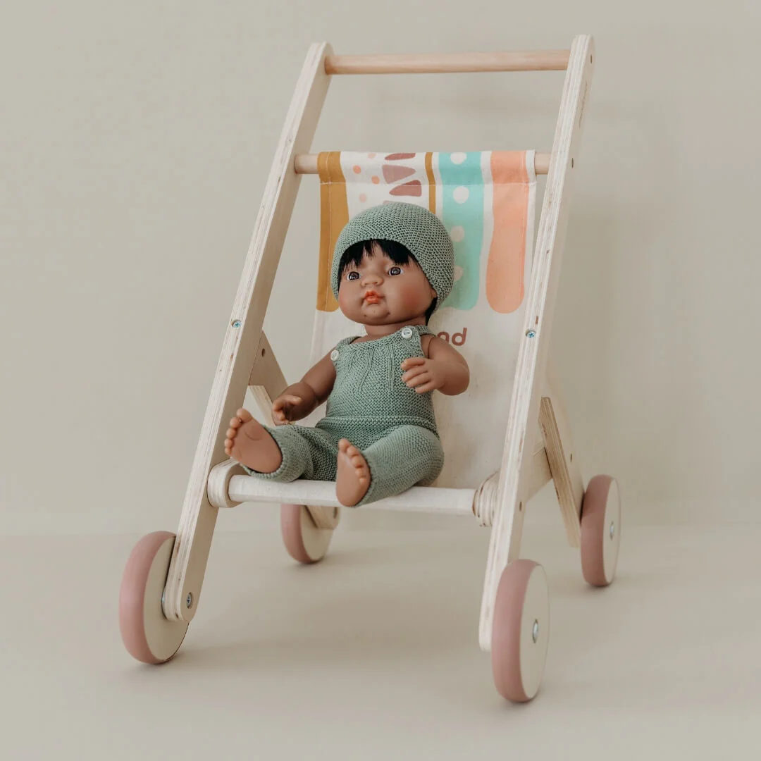 Drvena kolica za lutke izrađena su od drveta iz održivih šuma, što ih čini ekološki prihvatljivim i izdržljivim za dugotrajnu igru. Idealna su za simboličku igru, poticanje mašte i socijalnih vještina kod djece.