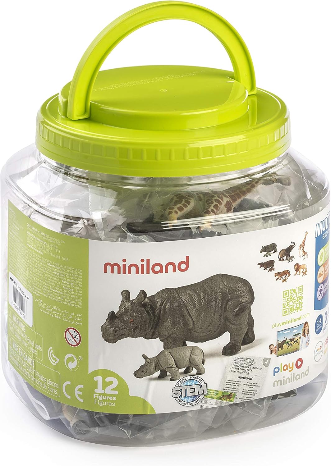 Set od 12 figura životinja izrađenih od izdržljive i kvalitetne plastike koje prikazuju različite vrste i njihove mladunce. Potiče učenje o životinjskom svijetu, uključuje priručnik za učitelje i brošuru o prehrani i staništima životinja. Kompatibilno s Miniland Teach&Play platformom za dodatne edukativne aktivnosti.