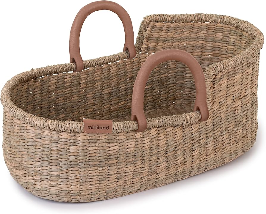 Košara za lutke s ručkama izrađena od morske trave omogućuje jednostavno nošenje Miniland lutaka veličine do 40 cm. Može se koristiti i kao mala kolijevka, što je čini praktičnim i funkcionalnim dodatkom za igru.