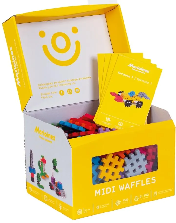 MIDI WAFFLE je serija kocki omiljena među najmlađom djecom. Njihov jedinstveni, fleksibilni oblik, prijateljske boje i neograničene mogućnosti gradnje očaravaju djecu i omogućuju igru koja podržava prirodni razvoj. Pružite svom djetetu trenutak igre s ovim inovativnim kockama i jamčimo da to vrijeme neće biti izgubljeno. Uz uključenu knjižicu s inspiracijama, djeca mogu graditi atraktivne oblike i figure ili koristiti vlastitu kreativnost za razvoj bilo kojih 2D ili 3D oblika.