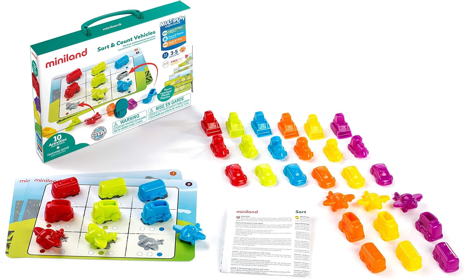 Edukativni set osmišljen za razvoj ranih matematičkih vještina kroz igru razvrstavanja i brojanja. Djeca razvrstavaju vozila prema boji, vrsti ili drugim zadanim kriterijima te pritom uče povezivati broj i količinu.