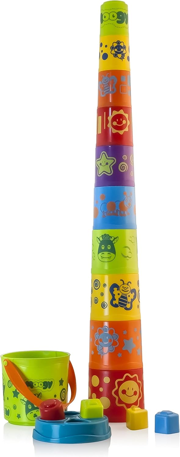 Velika kanta dolazi s perforiranim poklopcem koji sadrži 4 različita oblika, kroz koje se mogu umetnuti 4 uključena oblika kockica, čime se dodatno potiče razvoj koordinacije ruka-oko, prepoznavanja oblika i motoričkih vještina.